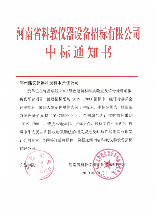 許昌學院2019-1788中標通知書