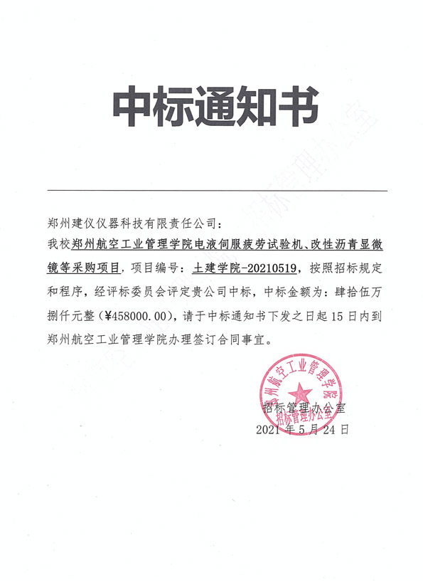 鄭州航空工業(yè)管理學院電液伺服疲勞試驗機、改性瀝青顯微鏡等采購項目