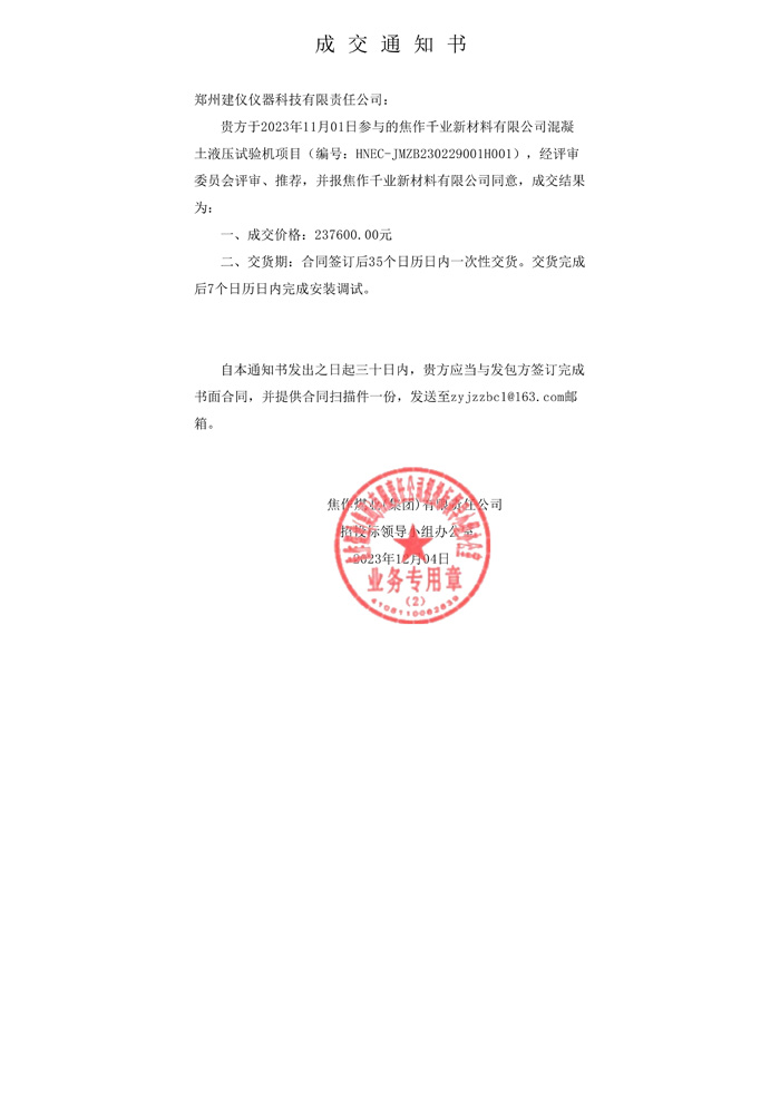 焦作千葉新材料混凝土液壓機(jī)成交通知書(shū)